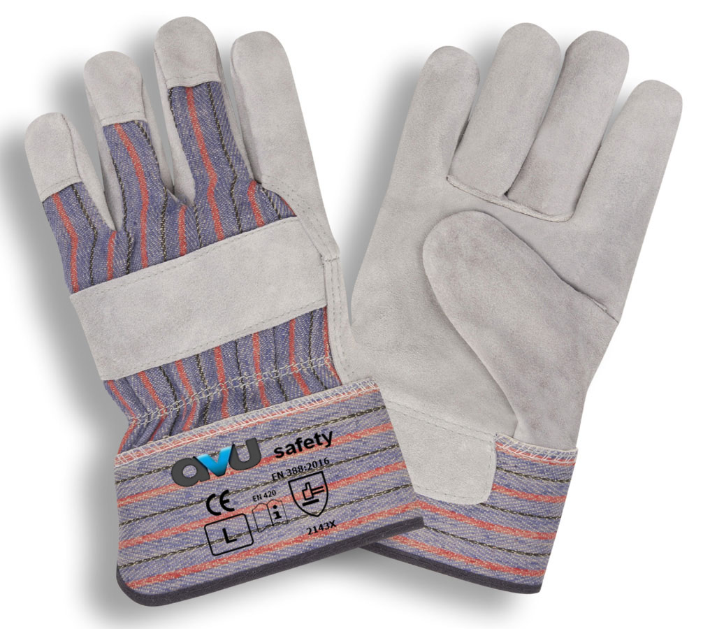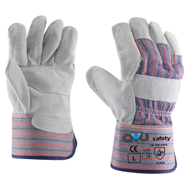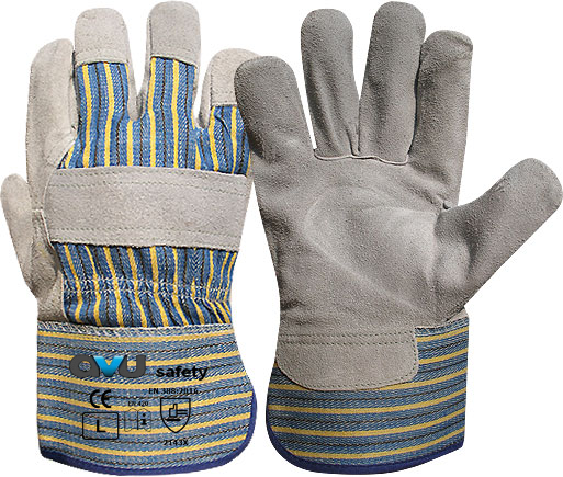 5-finger leather working gloves made of natural soft and flexible cow split leather palm covering index finger, pulse guard, wing thumb, three nail guards and knuckle strap. 160 GSM red-blue stripped cotton fabric back and 8cm rubberized cuff with cotton lining on the palm. Leather Thickness 1.0/1.1 mms (+) (-) 0.1 mms upto 10%