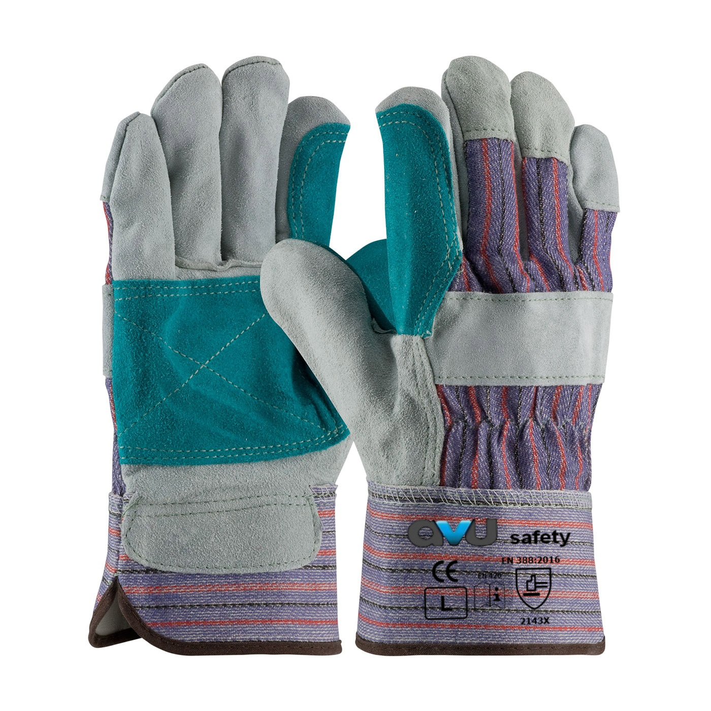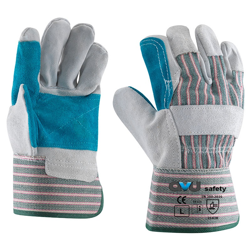 5-finger leather working gloves made of natural soft and flexible cow split leather palm covering index finger, pulse guard, wing thumb, three nail guards and knuckle strap With green dyed soft and flexible cow split leather reinforcement across the palm covering wing thumb and index finger.160 GSM red-blue,green stripped cotton fabric back and 8cm rubberized cuff with cotton lining on the palm. Leather Thickness 1.0/1.1 mms (+) (-) 0.1 mms upto 10%