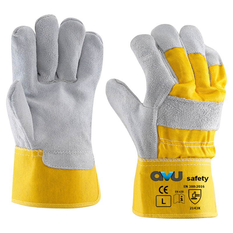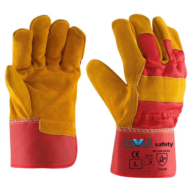 5-finger leather working gloves made of Yellow dyed soft and flexible cow split leather palm covering index finger, pulse guard, wing thumb, three nail guards and knuckle strap. 270 GSM RED dyed cotton drill fabric back and 8cm rubberized cuff with cotton lining on the palm. Leather Thickness 1.0/1.1 mms (+) (-) 0.1 mms upto 10%
