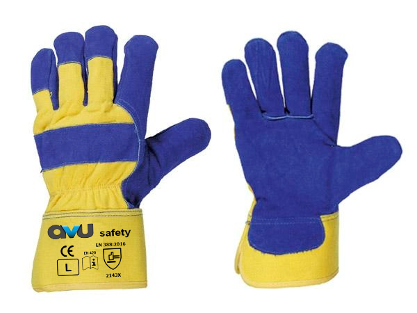 5-finger leather working gloves made of Blue dyed soft and flexible cow split leather palm covering index finger, pulse guard, wing thumb, three nail guards and knuckle strap. 270 GSM RED dyed cotton drill fabric back and 8cm rubberized cuff with cotton lining on the palm. Leather Thickness 1.0/1.1 mms (+) (-) 0.1 mms upto 10%