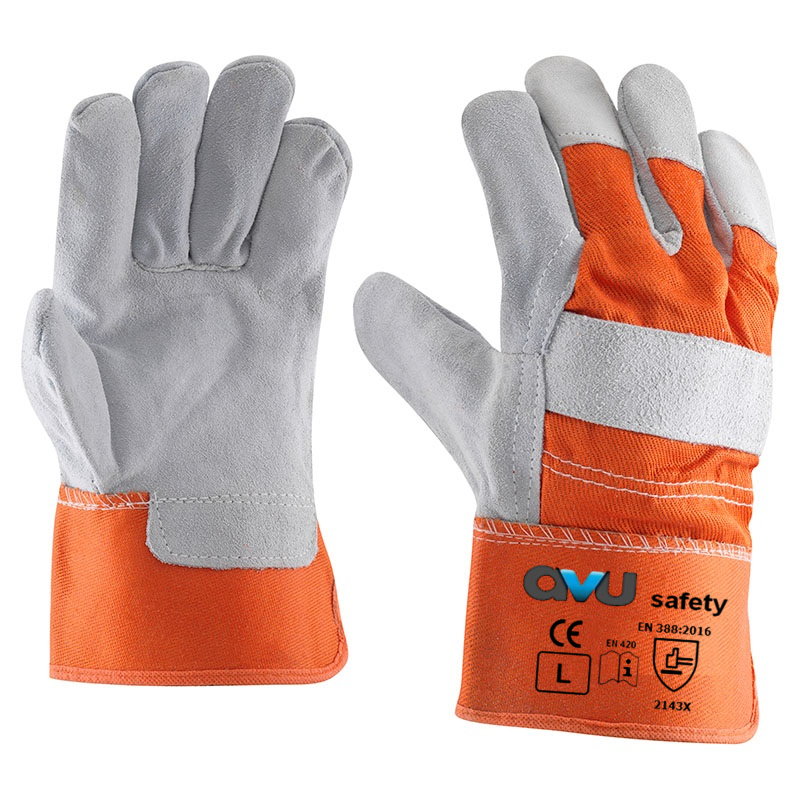 5-finger leather working gloves made of natural soft and flexible cow split leather palm covering index finger, pulse guard, wing thumb, three nail guards and knuckle strap. 270 GSM Orange dyed cotton drill fabric back and 8cm rubberized cuff with cotton lining on the palm. Leather Thickness 1.0/1.1 mms (+) (-) 0.1 mms upto 10%