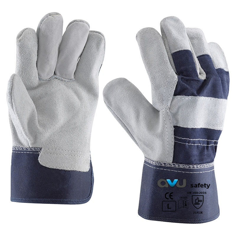 5-finger leather working gloves made of natural soft and flexible cow split leather palm covering index finger, pulse guard, wing thumb, three nail guards and knuckle strap. 270 GSM Blue dyed cotton drill fabric back and 8cm rubberized cuff with cotton lining on the palm. Leather Thickness 1.0/1.1 mms (+) (-) 0.1 mms upto 10%